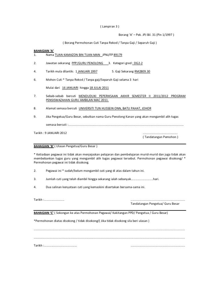 Pdf Borang 3c Borang Permohonan Cuti Cuti Tanpa Gaji Cuti Separuh Gajucuti Tanpa Rekod Di Bawah Perintah Am Bab C Sekolah Kebangsaan Bekenu Subis Academia Edu. Borang Permohonan Cuti Tanpa Gaji Urusan Peribadi Doc. Pekeliling Cuti Tanpa Gaji.