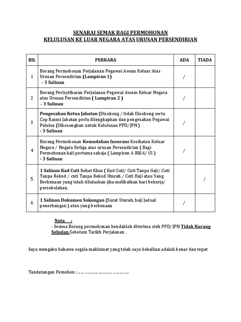 BORANG PENGISYTIHARAN PERJALANAN PEGAWAI AWAM KE LUAR NEGARA ATAS URUSAN PERSENDIRIAN MAKLUMAT PEMOHON Nama Pegawai. Jumlah Hari Cuti. Borang Insuran Ke Luar Negara Pdf.